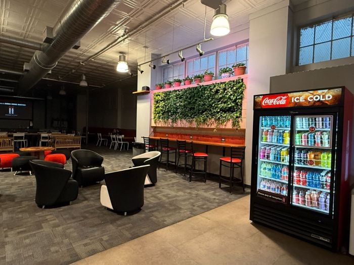 The facility is larger than we expected, with a comfortable lounge area for breaks, plenty of seating for non-players, and lockers for coats and bags.