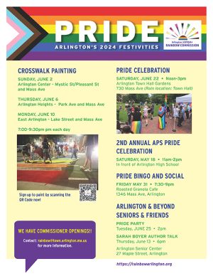 ON SATURDAY, JUNE 22 we will celebrate LGBTQIA+ Arlington Pride from 12-3pm at Town Hall Gardens.