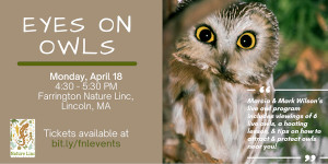 Join Farrington Nature Linc on April 18th at 4:30 PM ET for Eyes On Owls - a live owl program featuring six owls.Marcia Wilson, Naturalist of Eyes on Owls, will introduce the audience to owls found in New England and other parts of the world.