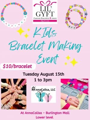 Bring your Children to AnnaCalisa at the Burlington Mall to create a one of a kind bracelet with the help of Delphine from Lil'Gyft.Choose from an array of beads, all material is provided.