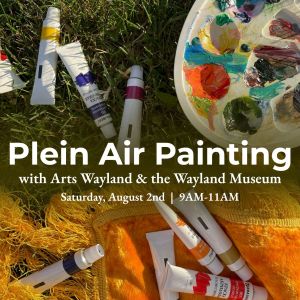 Join us on Saturday August 2nd from 9 am to 11 am (rain date will be Wednesday August 6th from 5:30-7:30 pm) for a fun outdoor painting experience combining art and local history!This free public event, presented by Arts Wayland and the Wayland Museum & Historical Society, invites artists of all ages and levels to bring their easels and paints to the museum grounds while learning about Wayland's historic district and landscape.