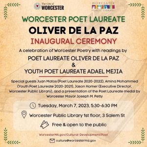 Join the City of Worcester on Tuesday, March 7, 2023 for the inaugural celebration of new Worcester Poet Laureate Oliver de la Paz!A reputable poet and renowned educator, de la Paz is the author of several poetry collections, including Requiem for the Orchard (2010), Furious Lullaby (2007), and The Boy in the Labyrinth (2019).