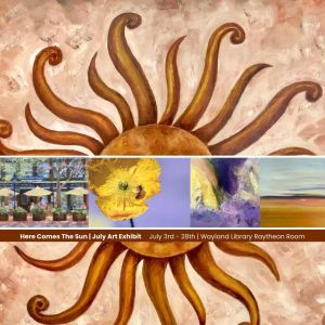 Visit The Wayland Library’s Raytheon Room through July 28th to see “Here Comes The Sun,” an in-person exhibit consisting of 36 pieces by 11 different Arts Wayland member artists.This collection showcases a vibrant and diverse selection of artworks and is a visual feast for art enthusiasts!