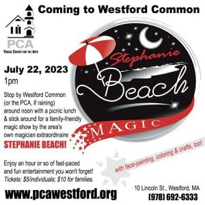 Stop by Westford Common (or the PCA, 10 Lincoln Street if the weather's not cooperating) around noon on July 22 with a picnic lunch and stick around for a 1pm, very family-friendly magic show by the area's own magician extraordinaire Stephanie Beach!Enjoy an hour or so of fast-paced and fun entertainment you won't forget!
