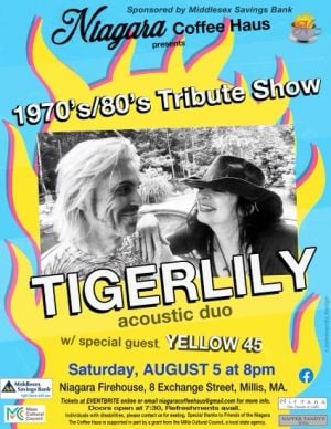 Info changes frequently. We cannot warrant it. Verify with Tigerlily (acoustic duo) 70s/80s tribute show! With special guest Yellow 45. before making the trek. If you find an error, please report it...