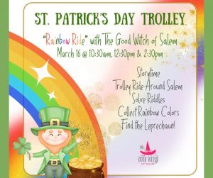 Embark on an enchanting adventure with the Good Witch of Salem and the mischievous Leprechaun aboard the Salem Trolley!The journey begins at The Good Witch of Salem’s shop with a story time all about rainbows and Leprechauns.