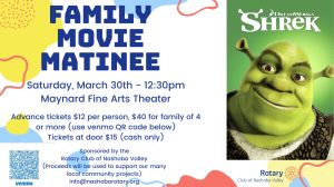 Join us on Saturday March 30th for the Family Movie Matinee! We will be showing the film Shrek. Tickets can be purchased using VENMO with the QR Code.Once upon a time, in a far away swamp, there lived an ogre named Shrek (Mike Myers) whose precious solitude is suddenly shattered by an invasion of annoying fairy tale characters.