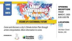Creative Malden, Coffee Shop Artists, and the City of Malden are proud to present “Our Warming Planet: Visions of a Sustainable Future,” an art exhibition inspired by Malden’s Climate Action Plan.Featuring over 20 local artists, the exhibition will run from March 5 to March 28, 2025 at 350 MAIN, 350 Main Street, Malden.