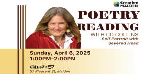 Join us for an afternoon with CD Collins, Malden’s Poet Laureate, as she brings her captivating storytelling, artistry, and signature style to life.Discover the power of words through “Self Portrait with Severed Head,” a compelling exploration of voice and narrative.