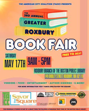 The Greater Roxbury Book Fair’s third annual event connects books and readers – and authors and artists and readers – in the Greater Roxbury community, and inspires new excitement and broader readership.Springing from the Roxbury community's deep connections to books and reading, the fair features local and aspiring authors – and showcases the creativity of the residents of Greater Roxbury.