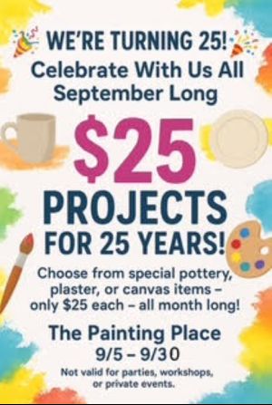 The Painting Place in Wellesley is turning 25, and they’re celebrating all September long with a special deal just for you!Choose from a variety of creative projects—pottery, plaster, or canvas—for just $25 each.