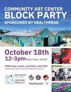 Join Community Art Center for a Block Party on Saturday, October 18th 12-3PM (rain date 10/19) at 125 Fawcett Street Cambridge, MA.Bring the whole family for this fun and FREE event with free food from Everybody Gotta Eat & Frosty's Ice Cream, activities, pony rides, and arts & crafts activities.