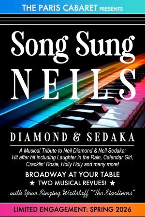 The Paris Cabaret presents SONG SUNG NEILS Diamond and Sedaka opening MAY 9th and 10th Our Musical Tribute to Neil Diamond and Neil Sedaka Hit after Hit including Laughter in The Rain, Calendar Girl, Cracklin Rosie, Holly Holy, Breakin up is hard to do , Forever in Blue Jeans and oh so so many more!!!Act 1 is our forever changing BROADWAY AT YOUR TABLE !