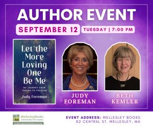 Judy will be in conversation with fellow Wellesley College alum, Beth Kemler.If you would prefer to RSVP by phone, you may call Wellesley Books at 781-431-1160.