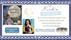 Join us for a meaningful story time, geared towards Healing After Loss, with Amanda Davis, author of Moonlight Memories.Amanda will do a story time with a meaningful art activity: coloring and decorating wooden moon/star ornaments with images, words, and/or colors that remind them of a loved one lost.