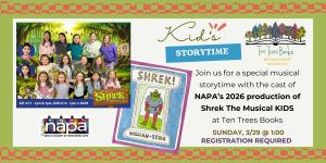 Come join the members of the cast of @napa.theaterarts 2026 production of Shrek The Musical KIDS, for a music filled storytime!Listen as the cast read aloud the original Shrek book and sing some hits for their upcoming show!