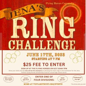 Jena’s Ring Challenge is a ring-catching competition to see who can catch the most rings during a ride around the Carousel.Competitors enter one of four divisions: Mini Junior: up to age 8; Junior: ages 9-15; Adult: ages 16+; Professional: any age (you know who you are!).