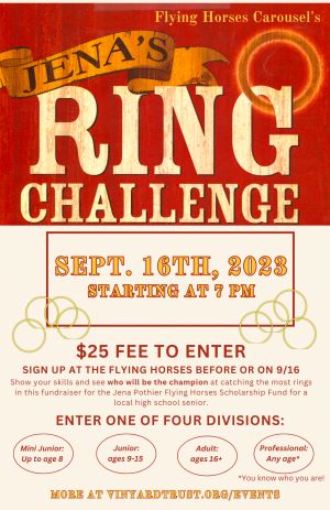 Jena’s Ring Challenge is a ring-catching competition to see who can catch the most rings during a ride around the Carousel.Competitors enter one of four divisions: Mini Junior: up to age 8; Junior: ages 9-15; Adult: ages 16+; Professional: any age (you know who you are!).