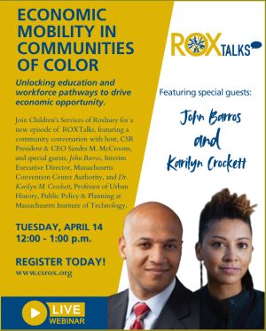 Children’s Services of Roxbury (CSR) is pleased to host John Barros, Interim Executive Director at the Massachusetts Convention Center Authority (MCCA), and Dr. Karilyn Crockett, Professor of Urban History, Public Policy, and Planning at MIT, as the featured guests for its next ROXTalks event.On Tuesday, April 14, from 12 to 1 p.m., CSR President and CEO Sandra M.