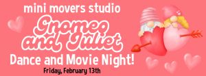 Enjoy a date night and have your child join Mini Movers Studio for a Valentine’s Day themed dance class followed by watching Gnomeo and Juliet with pizza and popcorn!Pre-registration required.