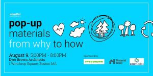 Please join us at 5pm on Tuesday August 9th at the Boston, Mass. headquarters of Dyer Brown Architects for a mindful MATERIALS pop-up event.Leading companies making sustainable building materials will showcase their work reducing or eliminating the negative environmental impacts of their products, and how designers and architects can help.