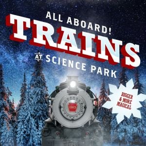 All Aboard! Trains at Science Park, our fun-for-all-ages seasonal exhibit, is back and it's bigger and better than ever — twice its original size with several new interactives and a captivating wintry environment brimming with nostalgia!Take in classic landscapes featuring miniature trains, snow-covered peaks, engaging activities, and even a few surprises.
