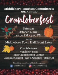 The 8th annual Crantoberfest to be held Saturday October 9, 2021 over Columbus Day weekend at the Middleborough Town Hall from noon to 5:00 p.m. This is great family friendly day!1:00pm – Cranberry Bake-Off (Prizes)