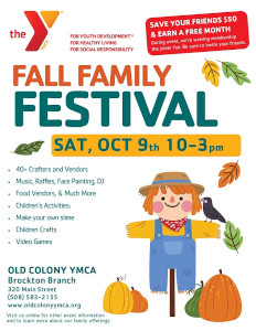 Join the Brockton Branch of the Old Colony YMCA October 9th from 10am-3pm for an exciting Fall Festival.We will have over 40 plus vendors, children activities, music, raffles, face-painting, make your own slime, children's crafts, video games and DJ.