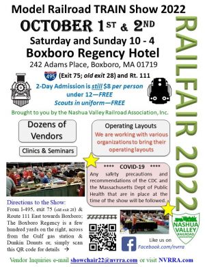 The Nashua Valley Model Railroad Assn is announcing its 57th annual “Railfair 2022” model train show on October 1-2, 2022.Attractions include model railroad displays, layouts, exhibits, dealers, and much more!