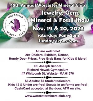 The 45th Annual Worcester Jewelry, Gem, Fossil & Mineral Show is sponsored by the Worcester Mineral Club.All are welcome!