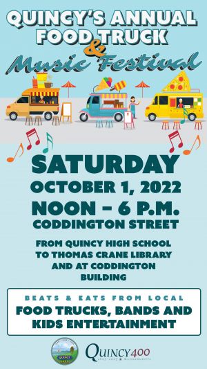 The City of Quincy’s annual Food Truck & Music Festival will take place Saturday, October 1st from noon – 6 p.m. on Coddington Street.The afternoon will include a wide variety of local bands, food trucks and kids entertainment.