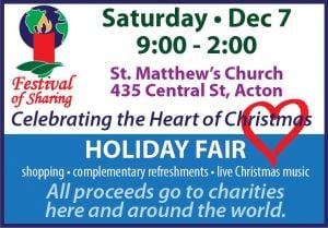 St. Matthew’s United Methodist Church in Acton will host its unique “Festival of Sharing” Holiday Fair on December 6 from 9 a.m. to 2 p.m. As always, all proceeds from the event will benefit local and international charitable organizations supported by St. Matthew’s.Last year, the annual Festival raised over $25,000 for 26 organizations.