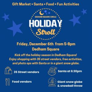 Dedham Square Circle's Holiday Stroll & Gift Market The 18th annual Dedham Square Holiday Stroll is a free event that kicks off the holiday season on the first Friday of December-rain or shine from 5-8pm.This year will be bigger, brighter, and more festive than ever!