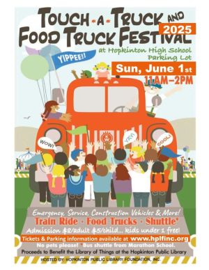 Hopkinton Public Library Foundation’s Touch-A-Truck and Food Truck Festival is back!This fundraising event will take place rain or shine on Sunday, June 1, 2025, from 11 a.m. – 2 p.m., at the Hopkinton High School Parking Lot.
