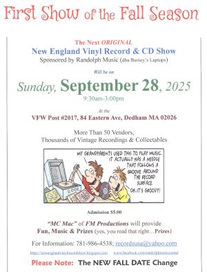 Biggest vinyl record show in the Boston area coming this Sunday Sept. 28, 2025.Longest running vinyl record show -- over 40 years and still going strong.