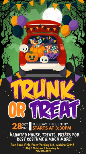 Step 1 Childcare will be hosting a Trunk or Treat event on Monday, October 28th, from 3:30 PM to 5:30 PM in the afternoon.This fun and family-friendly celebration will feature approximately 12 decorated cars, volunteered by our amazing parents, each offering candy and goodies to children in a safe and festive setting.