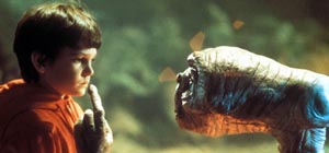 E.T. The Extra-Terrestrial (1982) is the immensely popular magical fantasy movie myth. Steven Spielberg's very personal, heartwarming sci-fi masterpiece (with special effects produced by George Lucas' Industrial Light and Magic Company) was warmly accepted by film audiences for its portrayal of the love between a young, fatherless suburban boy and a lost, benevolent and homesick visitor (presumably an adult) from another planet who is mistakenly left stranded and orphaned on Earth - three million light years from home.