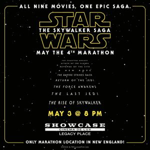 On May 3-4, Showcase Cinema de Lux Legacy Place in Dedham will be one of only 13 theaters nationwide, and the only location in New England, to host this exclusive marathon.Scheduled over “Star Wars Day” (May the 4th), fans will have the opportunity to view all nine films from the Star Wars saga during a 23-hour time period, including a special look at the upcoming Disney+ series “The Acolyte.”