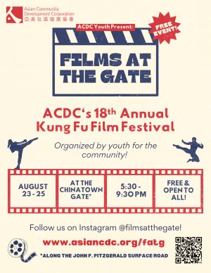 Films at the Gate, an event organized and run by ACDC youth, revives the tradition of the Chinatown movie house.The festival enlivens Chinatown, bringing together people of all backgrounds and ages, while also introducing kung fu films to a new generation and restoring a tradition of shared, public experience of Chinese-language films in Chinatown.
