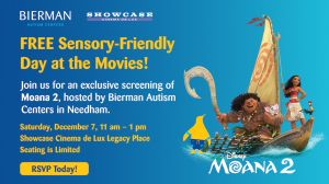 Subject Line: Join Us for a Sensory-Friendly Day at the Movies – Moana 2!Experience a magical, sensory-friendly screening of Moana 2 hosted by Bierman Autism Centers in Needham.