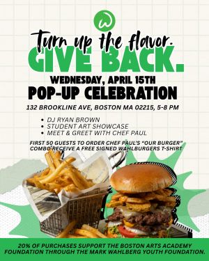Wahlburgers is teaming up with the Boston Arts Academy Foundation and the Mark Wahlberg Youth Foundation for an all-day giveback at Wahlburgers at The Fenway on One Boston Day – Wednesday, April 15.The celebration, on what is also World Art Day, featuring DJ Ryan Brown, a student art showcase, giveaways and an opportunity for guests to meet Chef Paul Wahlberg from 5–8 p.m. The first 50 guests who order Chef Paul’s burger combo will receive a free Wahlburgers T-shirt signed by him.