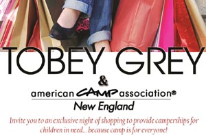 American Camp Association, New England is partnering with Tobey Grey for an exclusive night of discounted shopping on Wednesday, May 7th to raise funds to provide camperships for children in need.Admission is $30 and includes a 25% discount off everything in the store.