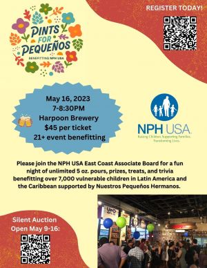 Please join the NPH USA East Coast Associate Bord on May 16th from 7PM-8:30PM for a fun night of unlimited 5 oz. pours, prizes, treats, and trivia benefitting over 7,000 vulnerable children in Latin America and the Caribbean supported by Nuestros Pequeños Hermanos.The event is located at Harpoon Brewery in Boston, MA and is a 21+ event.