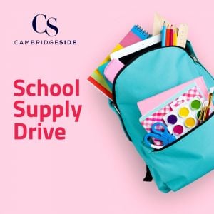 CambridgeSide has partnered with East End House to host a school supply drive to ensure all under-resourced and vulnerable children in the community will have necessary school supplies.Suggested new and unused items for donation include Backpacks, Pencil boxes, Pencils + Sharpeners, Pens, Crayons, Markers, Highlighters, Erasers, Scissors, Book Covers/Booksox, Art Supplies, Stickers, Glue/Glue Sticks, Notebook Paper, Construction Paper, Pocket Folders, Binders, Paints/Brushes, Calculators, Rulers, Colored Pencils, Educational Books, and Index Cards.