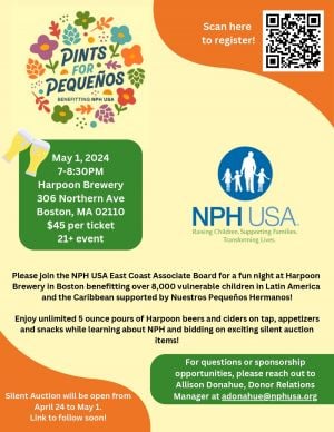 From 7:00 to 8:30 p.m., you will enjoy unlimited 5 ounce pours of Harpoon beers and ciders on tap, hors d’oeuvres and snacks while learning about NPH and bidding on exciting silent auction items!Must be 21+ to attend.