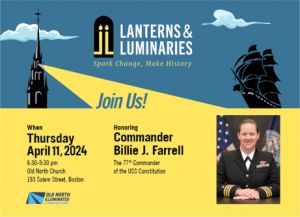 The celebration will feature festive music followed by remarks from the 2024 Third Lantern Award honoree Commander Billie J. Farrell, the 77th Commander and first female leader of the USS Constitution, a spirited performance of the poem 'Paul Revere's Ride,' and a lantern-lighting reenactment with Paul Revere on horseback.