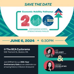 In 2024, Boston’s Economic Mobility Pathways (EMPath), a Boston-based nonprofit that supports families to move out of poverty, is thrilled to mark 200 years of empowering women and strengthening families.Our upcoming 200-Year Anniversary Gala on June 6, 2024 is set to be an unforgettable night, which will include dancing, storytelling and incredible food.
