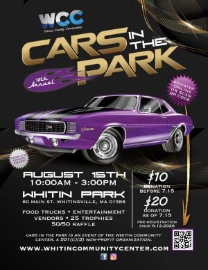 The Whitin Community Center (WCC) is excited to invite all automotive enthusiasts and families alike to celebrate the 12th Anniversary of our highly anticipated 'Cars In The Park' event.Join us for a day of automotive excellence and community fun on Saturday, August 15, 2026, from 10:00AM to 3:00PM at the picturesque 7.5 acre Whitin Park, located at 60 Main Street, Whitinsville.