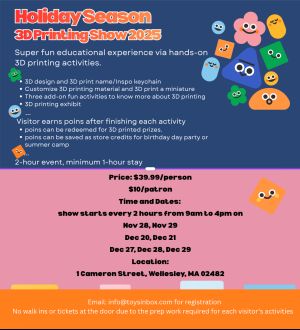 It is geared towards hands-on-activities and demonstrations and will take place on selected dates from November to December at Toysinbox 3D Printing Store located in Wellesley, MA.