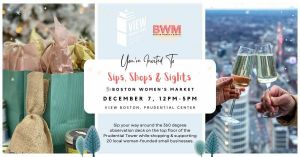 Join us at View Boston on Saturday, December 7, from 12–5 PM for Sips, Shops and Sights with Boston Women's Market!Shop from talented women-owned businesses while taking in the stunning views of the city.